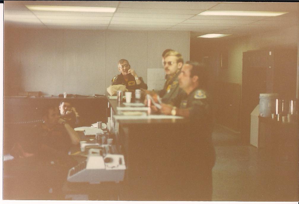 | The duty desk at Decimomannu in August 1980. Note Lt. Col Kemp on the phone, Ghost leaning on the counter, and Ray Winfree getting ready to step. |